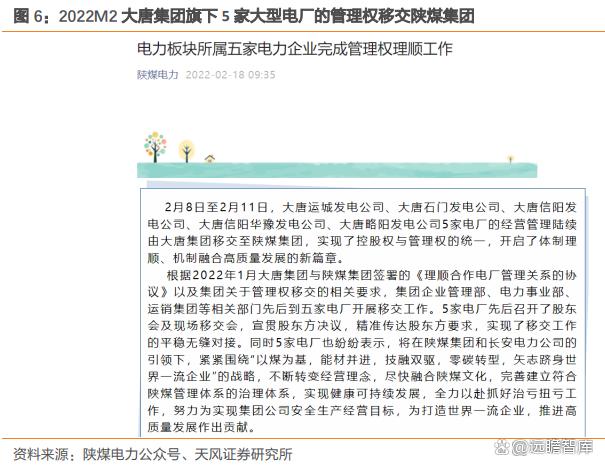 ? 大唐集團(tuán):2022M2 將旗下信陽(yáng)、信陽(yáng)華豫、略陽(yáng)、運(yùn)城、石門 5 家大型電廠的管理權(quán)移交給陜煤集團(tuán),實(shí)現(xiàn)控股權(quán)與管理權(quán)的統(tǒng)一。