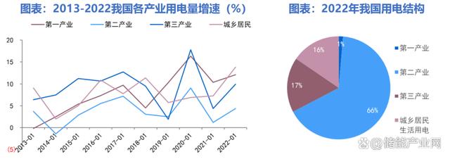 第三產(chǎn)業(yè)和居民用電增速快于工業(yè),負(fù)荷峰值增速大于用電量增速。近十年以來,我國(guó)第二產(chǎn)業(yè)增速相對(duì)較低,在用電結(jié)構(gòu)占比明顯降低,從2013年的73%下降至2022年的66%,第三產(chǎn)業(yè)和城鄉(xiāng)居民生活用電占比之和則由2013年的25%提高至2022年的33%。