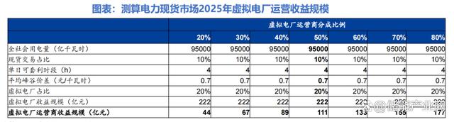 測(cè)算得到,通過電力現(xiàn)貨市場(chǎng)獲利模式下,當(dāng)虛擬電廠運(yùn)營(yíng)商分成比例為50%時(shí),虛擬電廠2025年運(yùn)營(yíng)市場(chǎng)規(guī)模為111億元。