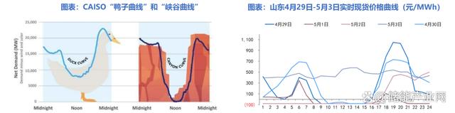 國(guó)內(nèi)以山東為代表的部分省份同樣有明顯的填谷需求。山東裝機(jī)結(jié)構(gòu)與CAISO相似,截至22年底,光伏裝機(jī)占比達(dá)到22.5%。在2023年五一假期期間,山東省內(nèi)用電負(fù)荷下降約15%,引發(fā)連續(xù)負(fù)電價(jià)現(xiàn)象。值得注意的是,4月29日-5月1日現(xiàn)貨價(jià)格曲線形狀類似鴨子曲線,期間10時(shí)-15時(shí)負(fù)電價(jià)出現(xiàn)尤為頻繁,而該時(shí)段為光伏發(fā)電高峰。