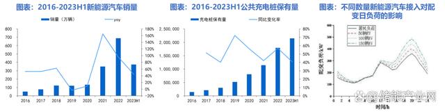 充電樁保有量隨新能源汽車快速提升,改變配電網(wǎng)形態(tài)。截至2023H1,我國(guó)公共充電樁保有量為214.86萬臺(tái),同比+40.63%。2023H1,新能源汽車銷量同比+44.13%,保持快速增長(zhǎng),可以預(yù)見未來隨新能源汽車銷量繼續(xù)快速提升,充電樁保有量將持續(xù)增加。充電樁的大量增加將對(duì)配電網(wǎng)產(chǎn)生沖擊,相比于常規(guī)交流充電樁,快充直流樁由于功率更大、充電時(shí)間更短,產(chǎn)生沖擊更大。
