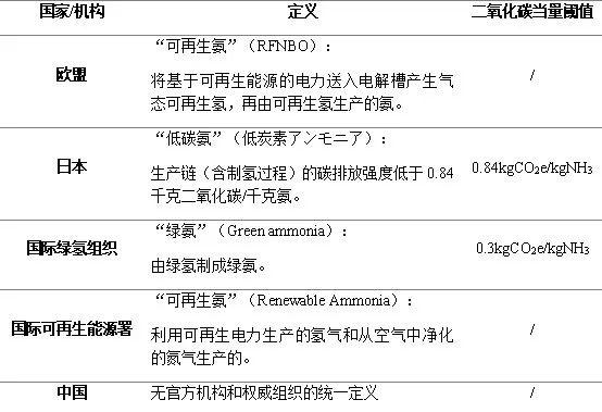 目前,國內關于“綠氨”尚無官方機構和權威組織的統(tǒng)一定義。行業(yè)內具備相關發(fā)聲,國內企業(yè)對綠氨的定義主要關注其原料氫是否由可再生能源電力制取,對生產過程中的碳排沒有明確的要求。