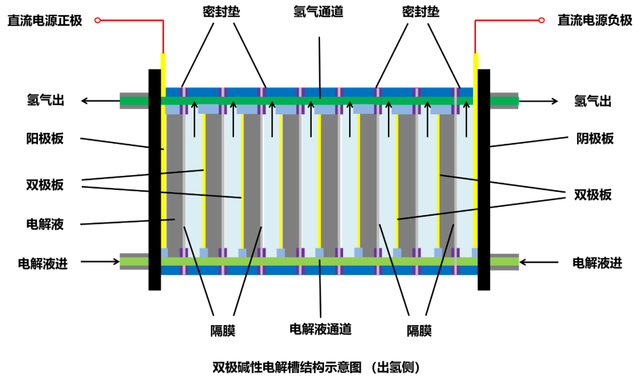堿性電解水制氫系統(tǒng)主要包括堿性電解槽主體和輔助系統(tǒng)(BOP)。堿性電解槽主體由端壓板、密封墊、極板、電板、隔膜等零部件組裝而成,電解槽包括數(shù)十甚至上百個電解小室,由螺桿和端板把這些電解小室壓在一起形成圓柱狀或正方形,每個電解小室以相鄰的2個極板為分界,包括正負雙極板、陽極電極、隔膜、密封墊圈、陰極電極6個部分。
