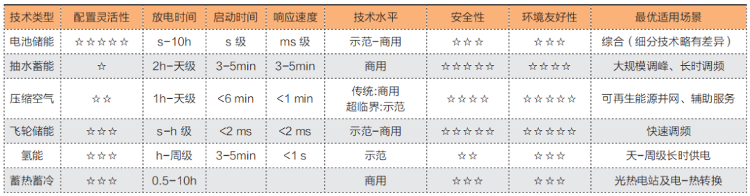 綜合分析各類儲(chǔ)能的技術(shù)特點(diǎn),從配置靈活性上看,電池儲(chǔ)能配置靈活性及可擴(kuò)展性最為優(yōu)異,抽水蓄能及傳統(tǒng)洞穴式壓縮空氣配置靈活性最差;從儲(chǔ)能發(fā)電時(shí)長(zhǎng)上看,氫能發(fā)電時(shí)間可達(dá)周級(jí),抽水蓄能及傳統(tǒng)洞穴式壓縮空氣次之,電池儲(chǔ)能放電時(shí)間基本在s-10h之間;從啟動(dòng)及響應(yīng)速度上看,飛輪、超級(jí)電容和電池儲(chǔ)能技術(shù)基本在ms-s級(jí)別,適用于快速響應(yīng)的調(diào)頻領(lǐng)域;從安全性上看,機(jī)械儲(chǔ)能安全性最為優(yōu)異,電化學(xué)儲(chǔ)能的安全性相對(duì)較弱。