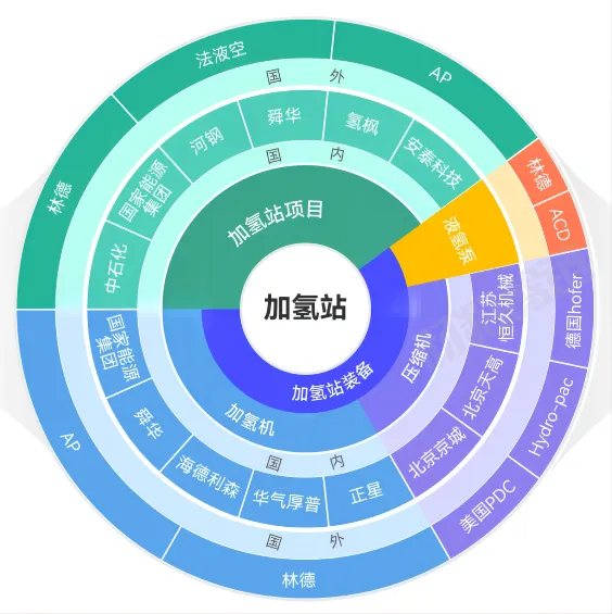氫能產(chǎn)業(yè)中游主要包括儲運氫和加氫站建設(shè)。儲運氫環(huán)節(jié),主要有高壓氣態(tài)儲氫、低溫液態(tài)儲氫、固體儲氫和有機液體儲氫等方式。當(dāng)前,美國、歐洲已分別建成2600km、1500km的氫管道,而我國氫氣管道里程約400km,在用管道僅有百公里左右。儲運氫環(huán)節(jié)成為我國氫能產(chǎn)業(yè)亟待攻克的環(huán)節(jié)。