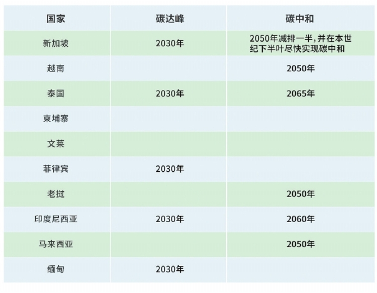 東盟各國碳達峰碳中和承諾時間表 (數(shù)據(jù)來源:各國自主貢獻目標、中長期減排發(fā)展戰(zhàn)略)