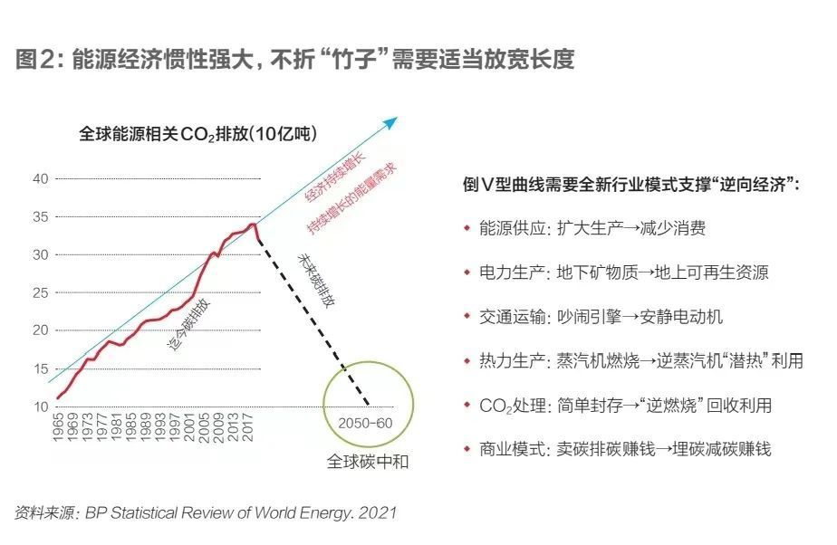 這個(gè)倒V型曲線需要全新的商業(yè)模式來(lái)支持逆向經(jīng)濟(jì),即所有的能源供應(yīng)、電力生產(chǎn)等都要反過(guò)來(lái),要從賣碳排碳賺錢的商業(yè)模式變成埋碳減碳賺錢的商業(yè)模式。