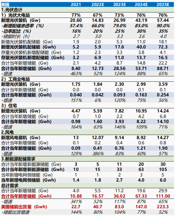 隨著多地儲能政策不斷出臺及市場機(jī)制日益完善,美國工商業(yè)儲能市場將逐步增長。綜上,預(yù)計(jì)2023年美國儲能市場總需求為36GWh,對應(yīng)出貨量為83GWh,裝機(jī)/出貨同增117%/104%,到2025年裝機(jī)/出貨需求為111GWh/223GWh,2022-2025年裝機(jī)/出貨CAGR分別為88.5%/76.4%。