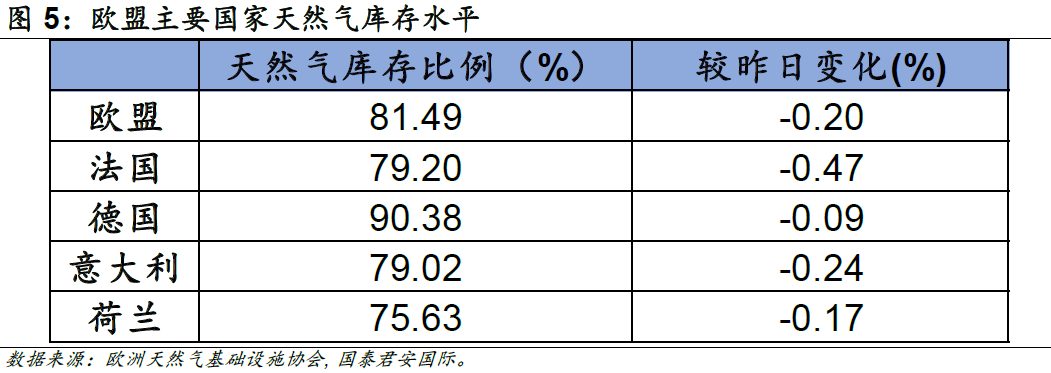 暖冬的到來極大程度上緩解了天然氣消耗的壓力,歐盟的天然氣庫存儲量超過最大儲量的80%,短期內(nèi)天然氣壓力不會顯著回升。歐洲天然氣基礎(chǔ)設(shè)施協(xié)會(GIE)數(shù)據(jù)顯示,截止2023年1月15日,歐盟27國的天然氣儲量超過最大儲量的80%,德國作為最主要的天然氣消耗國,庫存儲量甚至超過90%。暖冬導(dǎo)致對天然氣消耗需求的減少可以在相當(dāng)程度上緩解整體天然氣需求的壓力,短期來看,天然氣需求壓力不會顯著回升,通脹壓力有望持續(xù)放緩。