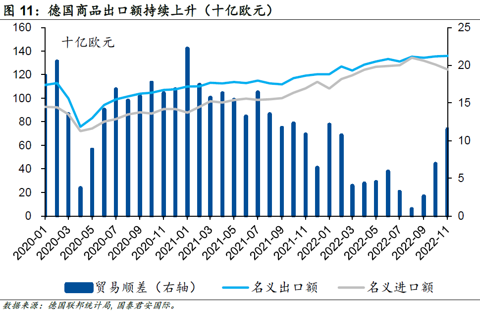 進(jìn)一步看,隨著疫情的相對穩(wěn)定,個人消費支出增長4.6%,對GDP增長起到了核心支撐作用。經(jīng)價格調(diào)整后,2022年德國商品出口額和進(jìn)口額比上年分別增長3.2%和6.7%。作為德國最為重要的貿(mào)易伙伴,中國的貿(mào)易數(shù)據(jù)已經(jīng)在2022年下半年明顯下滑,這也意味著支撐德國貿(mào)易的主要力量來自于歐元區(qū)自身以及其他主要發(fā)達(dá)經(jīng)濟體。