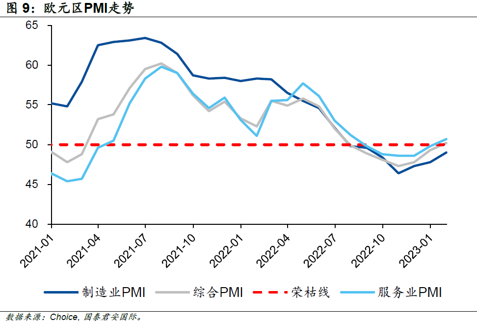 這一系列的政策效果在2022年末開始逐步顯露,歐洲的經(jīng)濟指標(biāo)開始出現(xiàn)回暖跡象。歐元區(qū)綜合PMI初值及服務(wù)業(yè)PMI初值在2023年1月扭轉(zhuǎn)了約半年的收縮趨勢,回到了榮枯線上方;雖然制造業(yè)PMI仍處于收縮區(qū)間,但是收縮幅度也大幅改善。