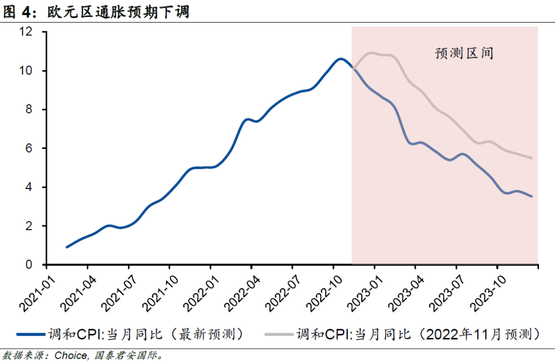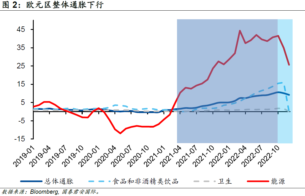隨著天然氣價格的迅速回落,歐元區(qū)整體通脹也隨之下行。歐元區(qū)2022年12月的能源通脹已經(jīng)由同年10月最高的41.5%大幅連續(xù)回落至25.7%,受此推動,整體通脹率亦由10月最高的10.6%連續(xù)回落至9.2%。