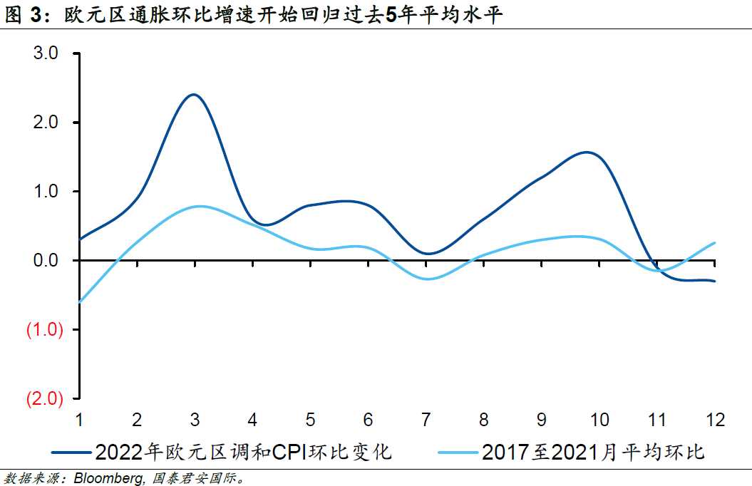另一方面,歐元區(qū)通脹環(huán)比增速顯著高于季節(jié)性的趨勢已經(jīng)開始扭轉(zhuǎn),這意味著通脹的增長動能開始減弱,2022年11月及12月已經(jīng)連續(xù)兩個月低于歷史平均水平。