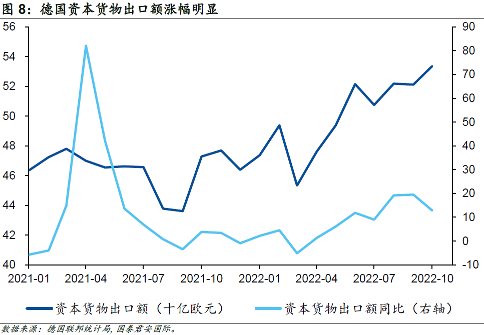 更加重要的是,為了應(yīng)對中長期能源危機,歐盟各國也開始加大對制造業(yè)的支持力度,制定了“能源系統(tǒng)數(shù)字化”計劃,該計劃預(yù)期在2030年前在基礎(chǔ)設(shè)施方面投資5,650億歐元,以大力發(fā)展光伏和新能源汽車產(chǎn)業(yè);除此以外,歐盟還加大了對液化天然氣產(chǎn)業(yè)的投資力度。德國作為歐洲經(jīng)濟的最重要組成部門,受益于政策支持,其工業(yè)生產(chǎn)并沒有受到太多能源問題的干擾,尤其是核心的資本貨物出口額在衰退預(yù)期的背景下持續(xù)增長。