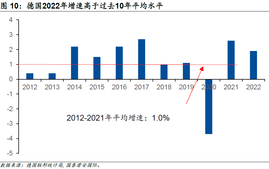 作為歐元區(qū)最大的經(jīng)濟體,近日公布的數(shù)據(jù)顯示,經(jīng)過價格調(diào)整后,德國2022年GDP同比增長1.9%,高于市場預(yù)期1.8%。不可否認(rèn)的是,俄烏沖突推升的天然氣價格給德國經(jīng)濟造成了相當(dāng)大的困擾,但是德國2022年GDP依舊增長1.9%,較2019年(新冠疫情開始前一年)高0.7個百分點,亦高于2012年至2021年的十年平均水平(1.0%)。