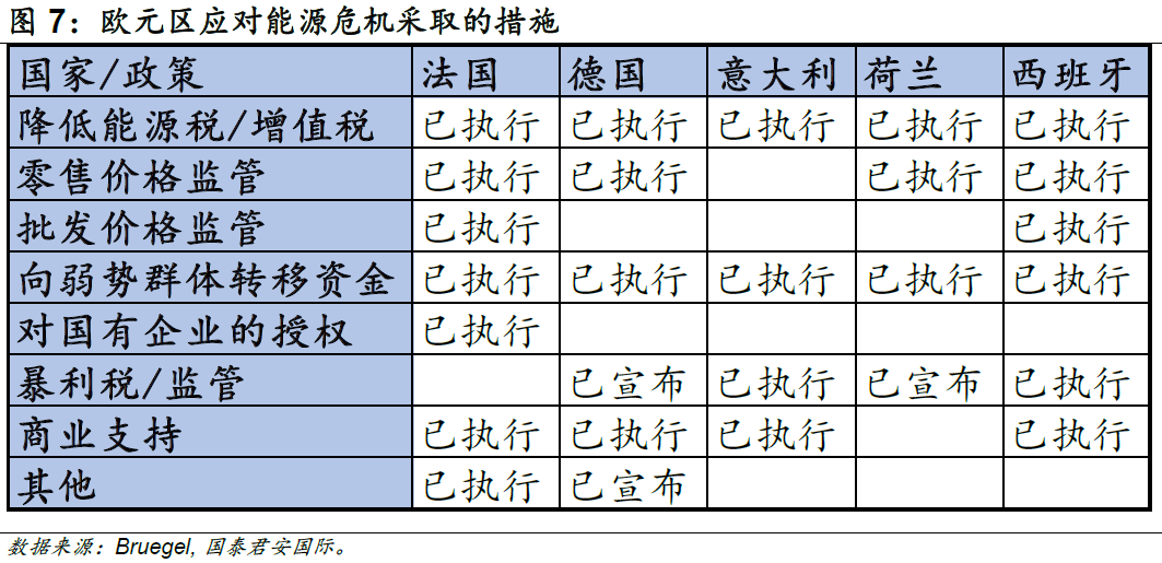 從總量政策來看,財政端的支持在很大程度上減輕了能源危機的沖擊。為應(yīng)對俄烏沖突帶來的能源問題,歐洲各國不約而同地采取了多種財政措施。根據(jù)Bruegel的統(tǒng)計,歐洲各國已經(jīng)撥款7,055億歐元用于緩解能源危機帶來的影響。歐盟撥款總計6,004億歐元,其中德國支出2,640億歐元,占2021年GDP的7.4%;英國撥款970億歐元,占2021年GDP的3.5%。