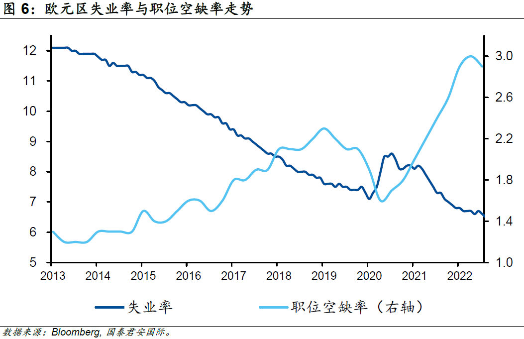 如果說天氣在很大程度上幫助了歐洲人,但歐洲經(jīng)濟超預(yù)期的根本原因大概率不是因為幸運或者天氣。進(jìn)一步來看,勞動力市場的火熱意味著經(jīng)濟維持著較好的動能。一方面,即使在能源價格高企的去年上半年,職位空缺率都處于上行趨勢中;另一方面,在緊張的企業(yè)用工環(huán)境中,歐元區(qū)的失業(yè)率開始走低,并迭創(chuàng)歷史低點。在之前通脹大幅高走的背景下,歐元區(qū)多個國家的工會已經(jīng)通過罷工的形式確定了未來的漲薪方案。與此同時,歐洲央行(ECB)基于通脹補償?shù)目紤],在2022年12月的最新預(yù)測中將2022-2024年的累積工資增長較2022年9月的預(yù)測值上調(diào)1.4個百分點。
