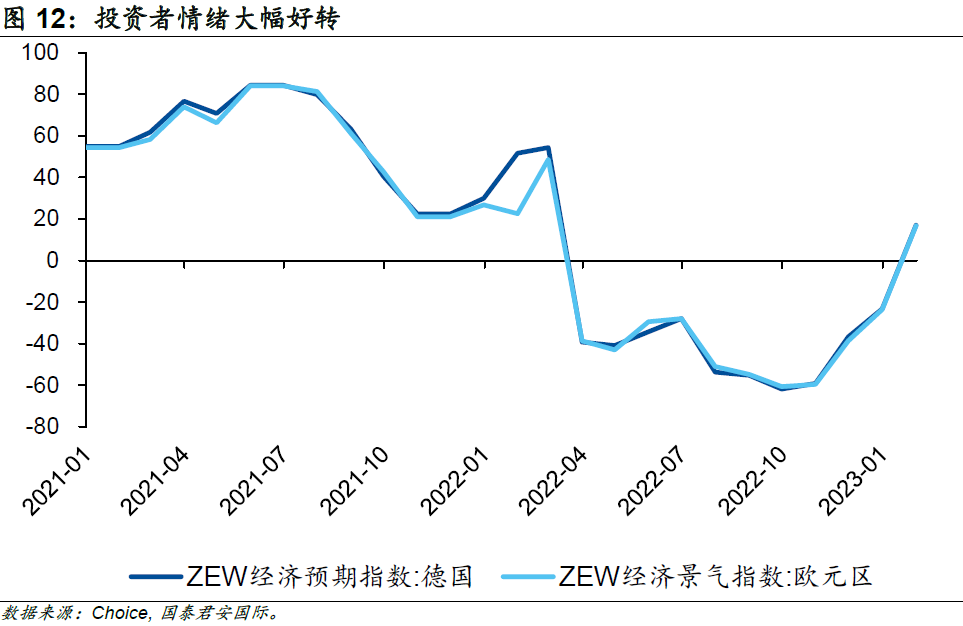 往前看,反映歐元區(qū)及德國投資者情緒的指標(biāo)“ZEW經(jīng)濟景氣指數(shù)”大幅好轉(zhuǎn)。在能源問題好轉(zhuǎn)、中國經(jīng)濟向好的背景下,能源密集型企業(yè)及出口型企業(yè)的盈利預(yù)期也開始上修,2023年1月德國ZEW經(jīng)濟景氣指數(shù)錄得16.9,遠(yuǎn)超預(yù)期值-15及前值-23.3。