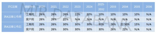美國IRA法案出臺,獨立儲能納入ITC補貼范圍,并將ITC補貼有效期將持續(xù)到2033年,并將抵免劃分為基礎(chǔ)抵免+額外抵免。其中基礎(chǔ)抵免額度由之前的26%上升至30%,此前為逐年退坡。具體變化情況如下表: