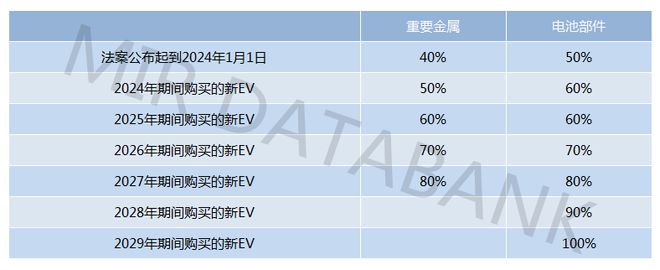 其中電池關(guān)鍵礦物原材料國產(chǎn)率部分規(guī)定:可得到補貼的新能源汽車的電池,其包含的適用關(guān)鍵礦物*中開采、加工或回收于美國及其自貿(mào)伙伴國家*的,需要逐年達到規(guī)定的百分比,否則該部分補貼不可獲得。電池部件國產(chǎn)率部分規(guī)定:電池中在北美制造或組裝的電池組件占整體電池成本的百分比需要逐年達到一定規(guī)定的百分比才能達標,獲得相應(yīng)部分的補貼。