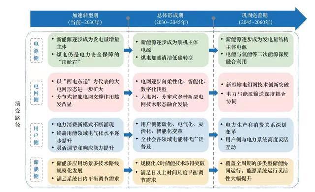 《藍(lán)皮書》指出,以2030年、2045年、2060年為新型電力系統(tǒng)構(gòu)建戰(zhàn)略目標(biāo)的重要時間節(jié)點,制定新型電力系統(tǒng)“三步走”發(fā)展路徑,即加速轉(zhuǎn)型期(當(dāng)前至2030年)、總體形成期(2030年至2045 年)、鞏固完善期(2045年至2060年),有計劃、分步驟推進(jìn)新型電力系統(tǒng)建設(shè)的“進(jìn)度條”。