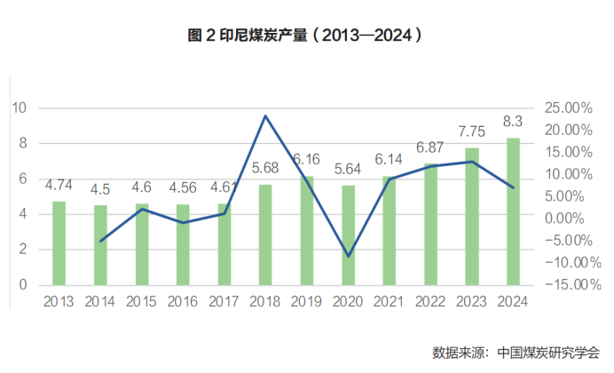 就石油、天然氣和煤炭化石能源稟賦而言,印尼油氣算不上富足,但煤炭資源豐富。印尼曾經(jīng)為OPEC成員國(guó),但在2003年成為石油凈進(jìn)口國(guó),并于2008年退出該組織。雖然印尼天然氣儲(chǔ)量排名東盟各國(guó)前列,但預(yù)計(jì)在2030年會(huì)變成天然氣凈進(jìn)口國(guó)。印尼煤炭?jī)?chǔ)量豐富,世界排名第六,儲(chǔ)采比為62。印尼是排名世界前列的煤炭生產(chǎn)和出口大國(guó)。根據(jù)印尼能源和礦產(chǎn)部相關(guān)數(shù)據(jù)統(tǒng)計(jì),2024年全年印尼煤炭產(chǎn)量已經(jīng)達(dá)到8.3億噸、出口4.3億噸。