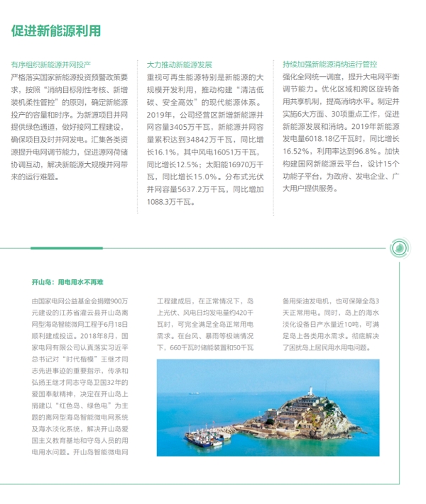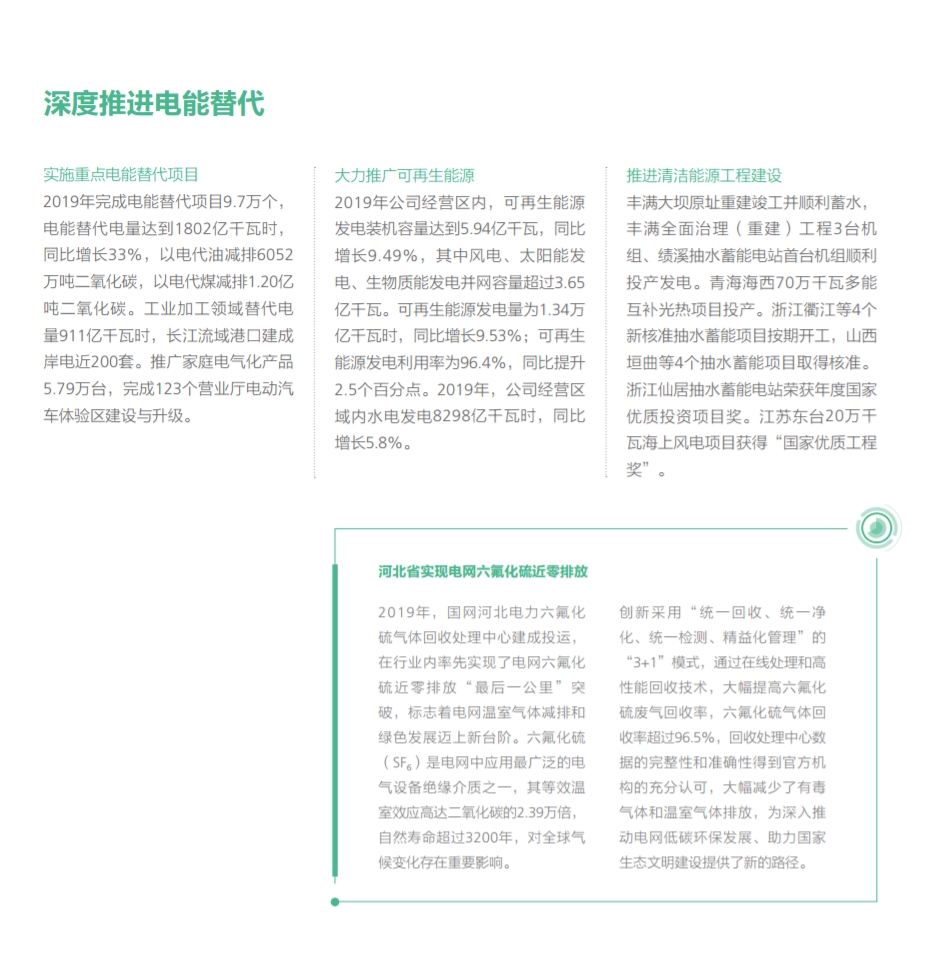 在努力做綠色發(fā)展的表率方面,國(guó)家電網(wǎng)有限公司認(rèn)真貫徹落實(shí)綠色發(fā)展理念,全力推進(jìn)生態(tài)文明建設(shè),推動(dòng)能源更高質(zhì)量、更可持續(xù)發(fā)展,以綠色低碳高效的充足電能,全力服務(wù)美麗中國(guó)建設(shè)。2019年經(jīng)營(yíng)區(qū)新增新能源并網(wǎng)容量3405萬(wàn)千瓦,新能源并網(wǎng)容量累積達(dá)到34842萬(wàn)千瓦,同比增長(zhǎng)16.1%,新能源云平臺(tái)接入新能源場(chǎng)站55萬(wàn)余座、裝機(jī)容量2.3億千瓦,累計(jì)交易額754.3億元,帶動(dòng)產(chǎn)業(yè)鏈上下游3000余家企業(yè)協(xié)同發(fā)展;完成電能替代項(xiàng)目9.7萬(wàn)個(gè),電能替代電量達(dá)到1802億千萬(wàn)時(shí),“煤改電”配套電網(wǎng)建設(shè)惠及19684個(gè)村、372萬(wàn)戶(hù)居民,以電代油減排二氧化碳6052萬(wàn)噸,以電代煤減排二氧化碳1.20億噸;智慧車(chē)聯(lián)網(wǎng)平臺(tái)累計(jì)接入充電樁43萬(wàn)個(gè),充電量達(dá)14.82 億千瓦時(shí),同比增長(zhǎng)73.86%。