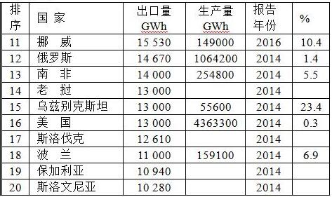 現(xiàn)在又看全球電力出口情況。表中%表示電力輸出量占該國生產量的份額。出口國約有95個國家或地區(qū),請點擊美國中央情報局網站:https://www.cia.gov/library/publications/the-world-factbook/rankorder/2234rank.html