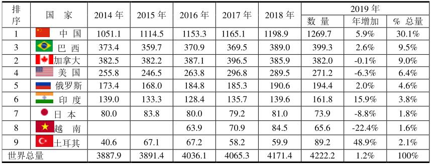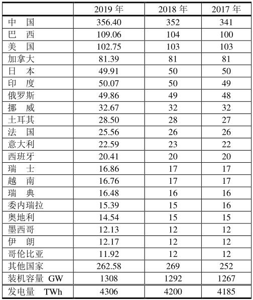 根據(jù)BP 2020的報(bào)告,中國水力發(fā)電量居世界之首,2019年占全球水力發(fā)電量的1269.7/4222.2=30.1%;其次為巴西、加拿大。