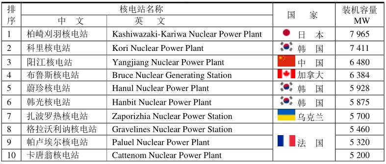 世界上最大的核電站是日本柏崎刈羽核電站,裝機(jī)容量為7965MW,但2011年已經(jīng)停工。值得注意的是韓國核電站進(jìn)展很快,前十位核電站就占有3席,把美國和日本都摔到后面。