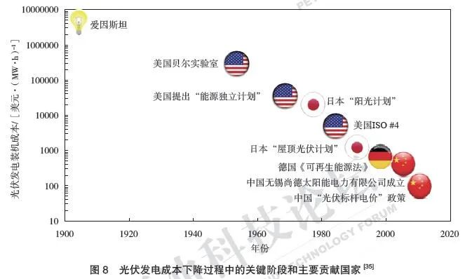 美國能源技術(shù)和公共政策學(xué)者Gregory F. Nemet于2019年出版著作《光伏如何變得便宜》(How Solar Became Cheap),書中介紹了光伏發(fā)電技術(shù)在歷史上的不同發(fā)展階段、成本變化的關(guān)鍵驅(qū)動因素、關(guān)鍵國家對成本降低的貢獻(xiàn),以及光伏發(fā)電對其他低碳能源技術(shù)發(fā)展的經(jīng)驗(yàn)?zāi)P?。光伏發(fā)電的4個(gè)關(guān)鍵階段為:(1)20世紀(jì)50—70年代美國早期實(shí)驗(yàn)室研究,推動每兆瓦時(shí)的裝機(jī)成本從10萬美元級降到1萬美元級;(2)20世紀(jì)90年代的日本“屋頂光伏計(jì)劃”,推動每兆瓦時(shí)裝機(jī)成本降至1000美元級;(3)21世紀(jì)初德國《可再生能源法》的發(fā)布實(shí)施,推動裝機(jī)成本降至1000美元/(MW·h)以下;(4)中國以“光伏標(biāo)桿電價(jià)”等強(qiáng)力政策推動產(chǎn)業(yè)發(fā)展,促進(jìn)裝機(jī)成本降至100美元/(MW·h)以內(nèi)(圖8)。