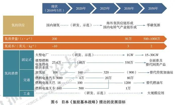 在能源消費(fèi)方面,2012—2016年,日本能源消費(fèi)總量減少了6.1%,接近實(shí)現(xiàn)2030年節(jié)能目標(biāo)所需的平均速度。日本能源轉(zhuǎn)型以氫能規(guī)?;脼轱@著特色和重要抓手,將氫能與電力和熱能并列定位為核心二次能源,并提出建設(shè)“氫能社會”的愿景,希望通過氫燃料電池實(shí)現(xiàn)氫能在家庭、工業(yè)、交通甚至全社會領(lǐng)域的應(yīng)用。日本在《氫能基本戰(zhàn)略》提出的主要發(fā)展目標(biāo)詳見圖6。