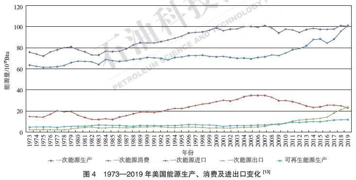 與歐洲的高比例可再生能源、激進(jìn)的碳減排目標(biāo)政策不同,美國能源轉(zhuǎn)型是在實(shí)現(xiàn)“能源獨(dú)立”的前提下推動能源系統(tǒng)清潔化,以增加清潔能源(包括核電、可再生能源、天然氣和潔凈煤等)應(yīng)用比例為主要手段。2000年,美國和德國化石能源占一次能源消費(fèi)總量的比例分別是85%和88. 6%,從這一角度來看兩國能源轉(zhuǎn)型起點(diǎn)相似;2018年,美國和德國可再生能源在一次能源消費(fèi)量中所占比例分別為11.4%和16.6%,德國略勝一籌??v觀1973年以來美國的能源生產(chǎn)、消費(fèi)和進(jìn)出口情況,自2005年起,美國可再生能源和核電產(chǎn)量快速增長,清潔能源消費(fèi)比例加速上升;2010以來,一次能源產(chǎn)量快速增長,并在2019年實(shí)現(xiàn)了“能源獨(dú)立”(圖4)。