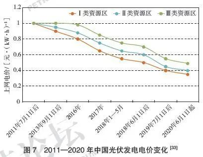 近年來,在全球可再生能源成本迅速下降的過程中,除了政策支持和技術(shù)進(jìn)步以外,產(chǎn)業(yè)規(guī)模經(jīng)濟(jì)和規(guī)模效益是不容忽視的重要推力。中國得益于較為完備的基礎(chǔ)工業(yè)體系和龐大的市場,在推動風(fēng)電、光伏發(fā)電、生物質(zhì)發(fā)電、動力電池、氫能利用等產(chǎn)業(yè)發(fā)展過程中,發(fā)揮了巨大的規(guī)模經(jīng)濟(jì)優(yōu)勢。2013年以來,在國家政策的大力支持下,中國光伏發(fā)電產(chǎn)業(yè)不斷擴(kuò)大規(guī)模,迅速發(fā)展為全球最大的市場,同時(shí)也擺脫了困擾光伏產(chǎn)業(yè)多年的“兩頭在外”的尷尬局面。2013—2018年,中國光伏裝機(jī)容量達(dá)到1.74×108kW,年復(fù)合增長率超過73%,較2012年的0.065×108kW增長26 倍。光伏發(fā)電上網(wǎng)電價(jià)從2011年的1元/(kW·h),下降到2020年的0.35~0.49 元/(kW·h)(2020年6月1日開始實(shí)施)(圖7)。在這一過程中,國內(nèi)涌現(xiàn)出一批優(yōu)秀的光伏企業(yè),在2019全球光伏企業(yè)20強(qiáng)排行榜上有16家中國公司,前10名中有7家中國公司。