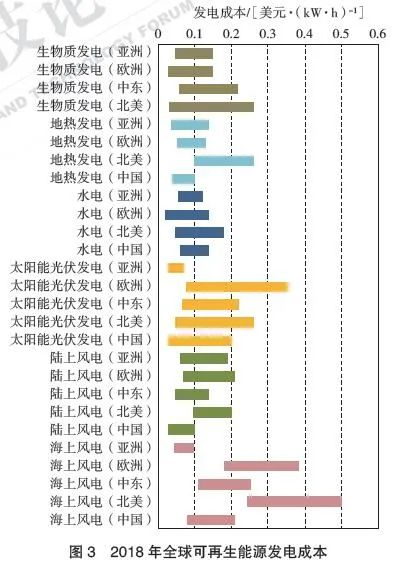 第三,可再生能源大規(guī)模開發(fā)利用。風(fēng)力發(fā)電和太陽能光伏發(fā)電成為全球成本下降最快、平均成本最低的可再生能源發(fā)電方式。2018年,除海上風(fēng)電以外,全球各地多種可再生能源發(fā)電技術(shù)的成本開始具備較強(qiáng)的成本競爭力(圖3)。在許多國家和地區(qū),可再生能源已開始了對化石能源發(fā)電的存量替代。中國是世界上可再生能源利用規(guī)模最大、平均成本最低的國家,從2014年開始,每年的風(fēng)電和太陽能發(fā)電量均超過全社會新增用電量。