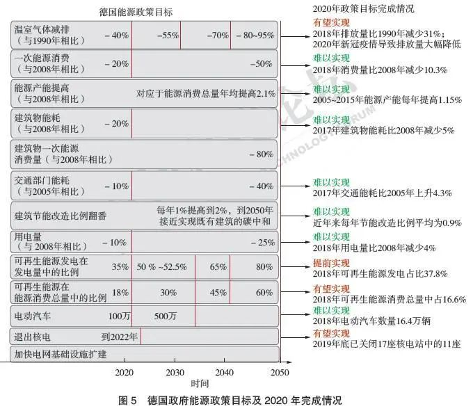 德國能源資源稟賦不佳,除了煤炭儲量相對豐富外,石油和天然氣高度依賴進(jìn)口。德國能源轉(zhuǎn)型實(shí)踐始于21世紀(jì)初,確立了“能源安全、經(jīng)濟(jì)效率和環(huán)境可承受”的能源政策三大目標(biāo),核心思想是可持續(xù)發(fā)展。2000年,德國出臺《可再生能源法》,確定了可再生能源發(fā)展的多項(xiàng)激勵措施,并分別在2004年、2009年、2012年、2014年針對實(shí)際情況做出修訂和調(diào)整。2014年底,德國頒布《國家能效行動計(jì)劃》,對能源消費(fèi)總量、建筑能效和交通能效等提出行動目標(biāo)??疾?020年之前所完成的半數(shù)轉(zhuǎn)型目標(biāo),與其他國家相比,德國是能源轉(zhuǎn)型的“優(yōu)等生”(圖5)。