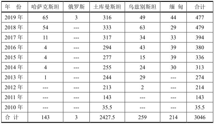 世界上天然氣儲(chǔ)量最多的國(guó)家是俄羅斯,土庫(kù)曼斯坦居世界第四位。中國(guó)管輸天然氣進(jìn)口依靠資源豐富的俄羅斯和中亞國(guó)家,最早的最重要的出口國(guó)是土庫(kù)曼斯坦,于2010年開始出口,到2019年總量已經(jīng)達(dá)到2427.5億立方米;其次是烏茲別斯坦、緬甸和哈薩克斯坦。俄羅斯從2019年也開始出口到中國(guó),而且將會(huì)逐年增加,成為管輸出口到中國(guó)最多的國(guó)家。