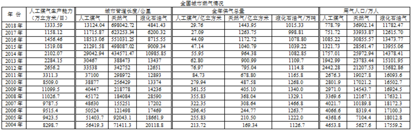 根據(jù)中國國家統(tǒng)計(jì)局的數(shù)據(jù)可以看出,在城市范圍內(nèi)人工煤氣的產(chǎn)量、管線長度和用氣人口在逐年下降,液化石油氣的管線長度和用氣人口也是逐年下降。而天然氣的城市管線長度、供氣量和用氣人口卻逐年上升。