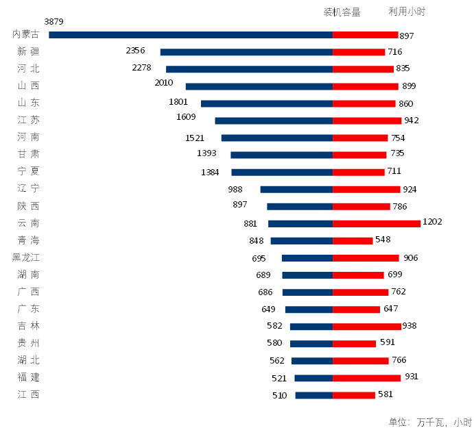 圖3 1-4月份風電裝機較多省份風電裝機容量和設備利用小時