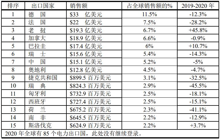 按價值計算,列出的15個國家2020年出口的電力占全球出口的71.2%。