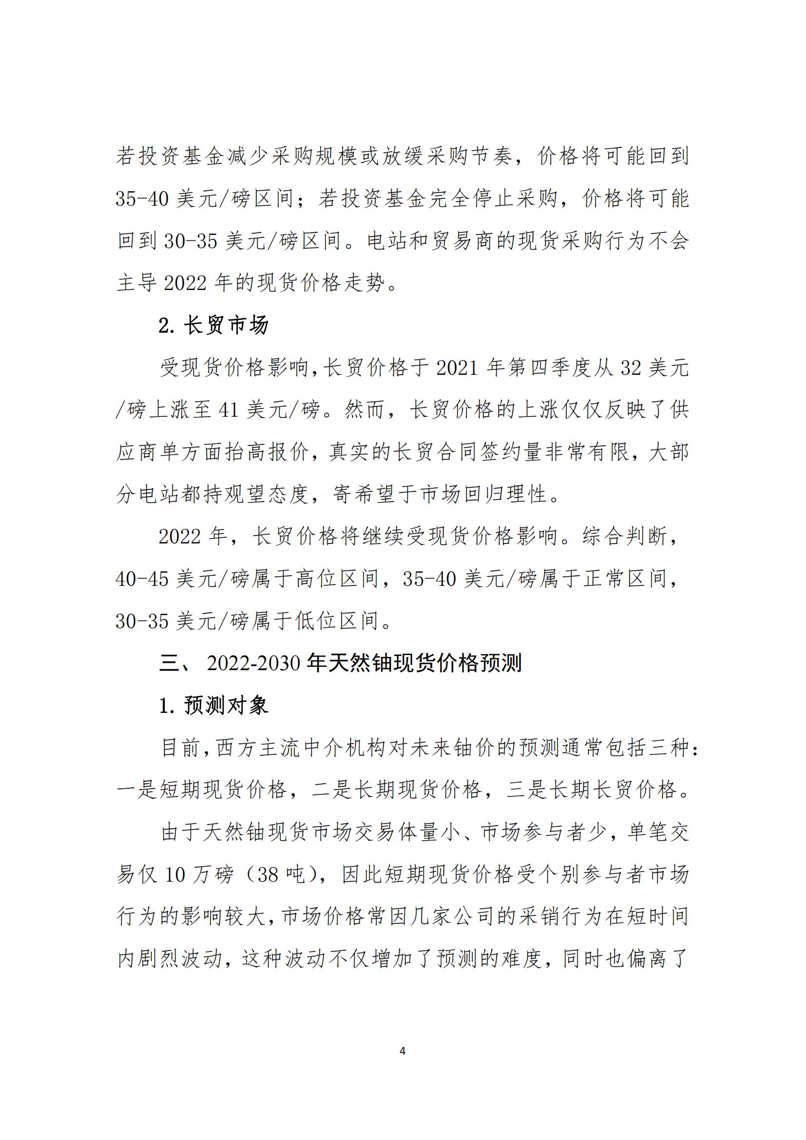 2022年2月7日,虎年春節(jié)后第一個(gè)工作日,由中國電力發(fā)展促進(jìn)會(huì)核能分會(huì)編制的2022年第一期天然鈾價(jià)格預(yù)測(cè)報(bào)告發(fā)布,電力網(wǎng)獲悉,今后報(bào)告將每季度發(fā)布一次,一年四期。