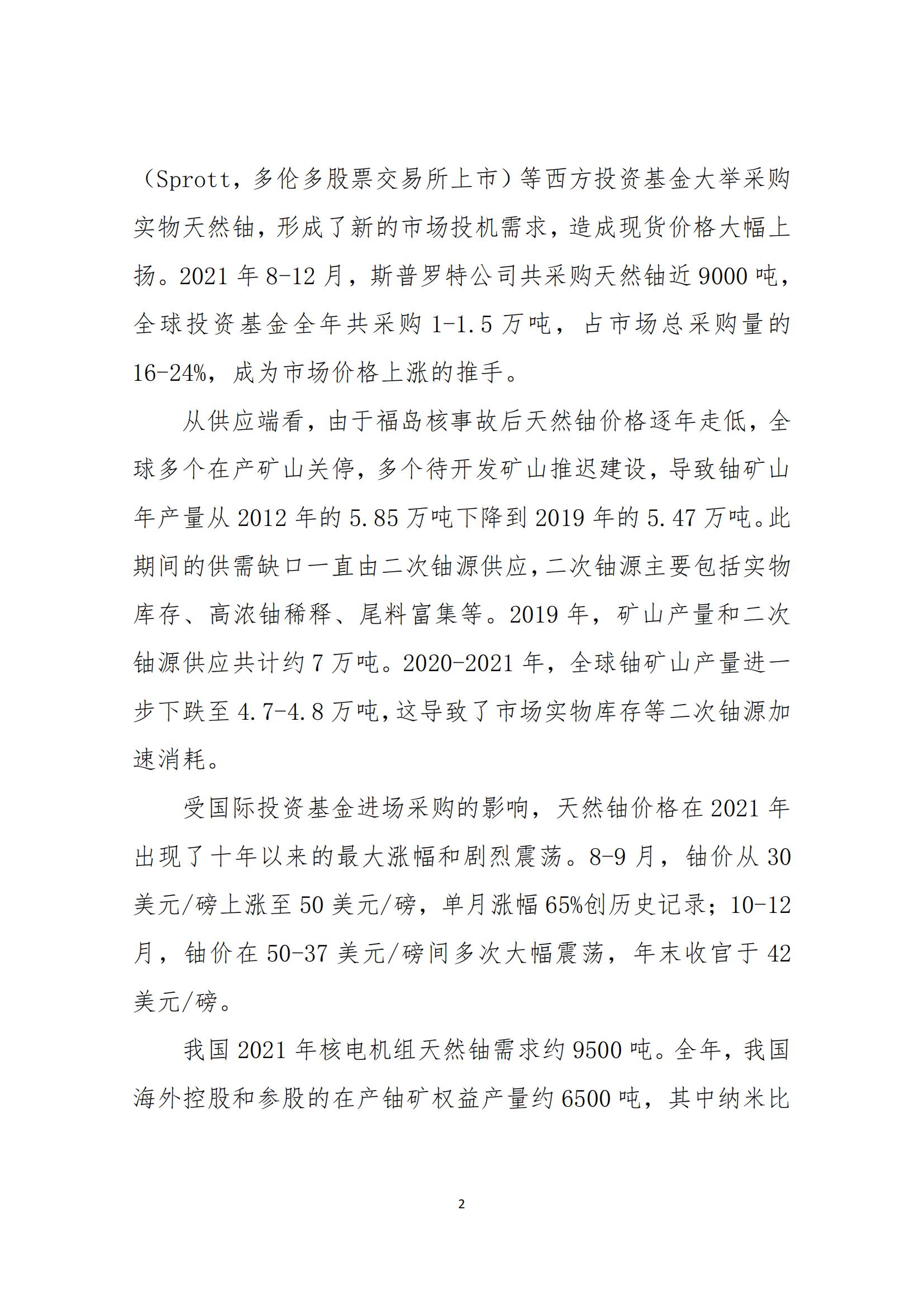 報(bào)告認(rèn)為,2021年的全球天然鈾市場(chǎng),仍供大于求,但正逐步趨于平衡。值得注意的是,2018年以來,黃餅公司(Yellow Cake,倫敦股票交易所上市)和斯普羅特公司(Sprott,多倫多股票交易所上市)等西方投資基金大舉采購實(shí)物天然鈾,形成了新的市場(chǎng)投機(jī)需求,造成現(xiàn)貨價(jià)格大幅上揚(yáng)。8-9月,鈾價(jià)從30美元/磅上漲至50美元/磅,單月漲幅65%創(chuàng)歷史記錄;10-12月,鈾價(jià)在50-37美元/磅間多次大幅震蕩,年末收官于42美元/磅。我國海外鈾礦權(quán)益產(chǎn)品為核電天然鈾供應(yīng)提供了有力保障,并在國際大宗商品價(jià)格大幅上漲的背景下,有效抑制了天然鈾價(jià)格上漲,很好地發(fā)揮了保供穩(wěn)價(jià)作用。