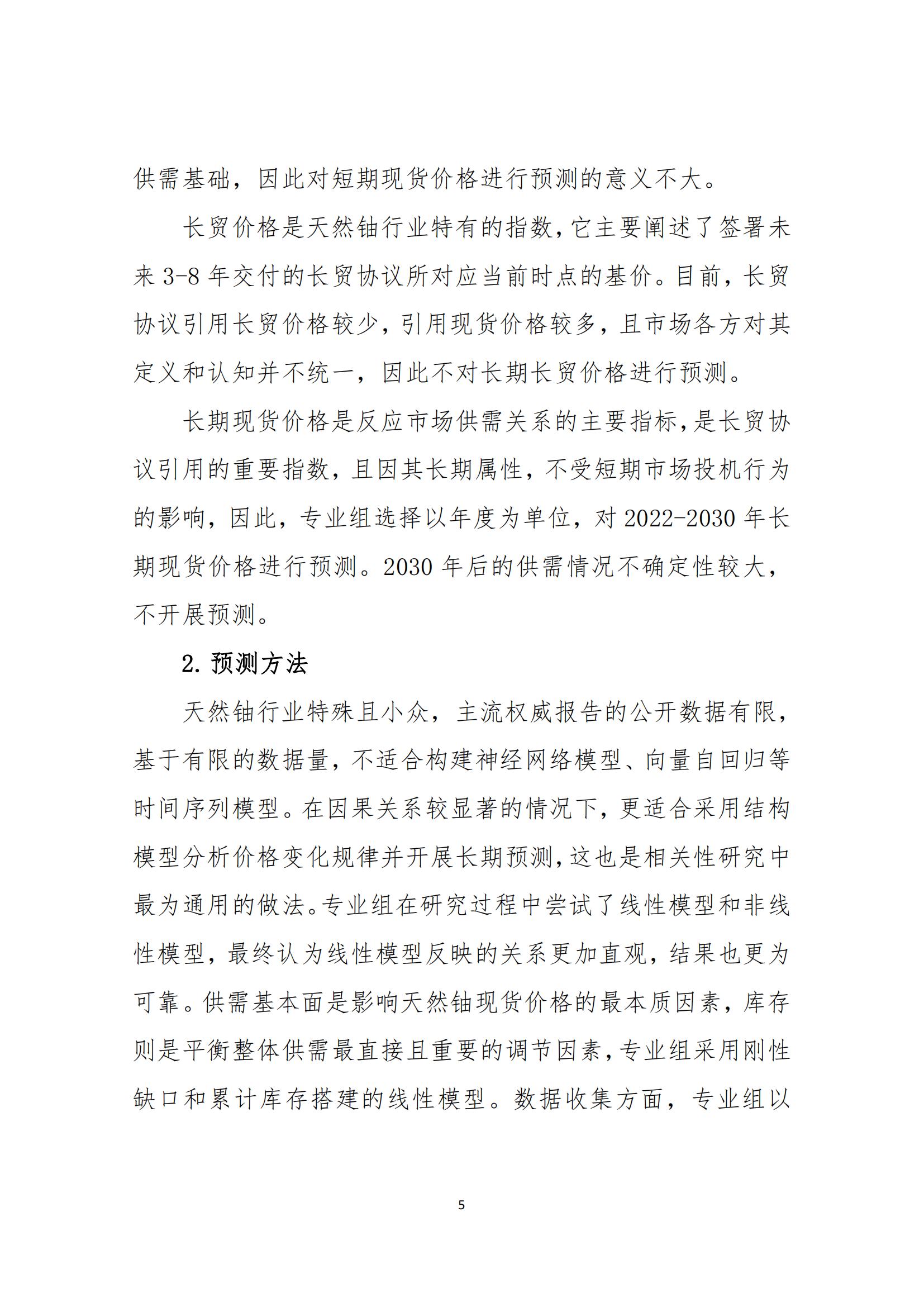 報(bào)告還對(duì)2022-2030年天然鈾現(xiàn)貨價(jià)格作了預(yù)測(cè)。之所以選擇對(duì)長(zhǎng)期現(xiàn)貨價(jià)格進(jìn)行預(yù)測(cè),是因?yàn)樵搩r(jià)格是反應(yīng)市場(chǎng)供需關(guān)系的主要指標(biāo),是長(zhǎng)貿(mào)協(xié)議引用的重要指數(shù),且不易受到短期市場(chǎng)投機(jī)行為的影響。