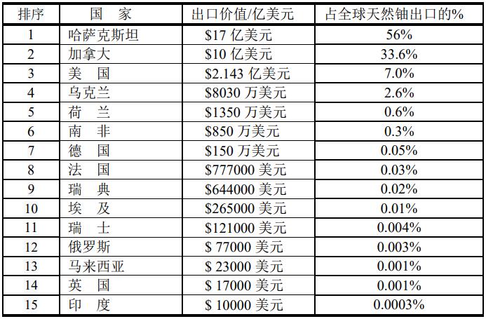 2020年出口價(jià)值最高的天然鈾的15個(gè)國(guó)家,這15個(gè)國(guó)家出口天然鈾占總量的99.999%。