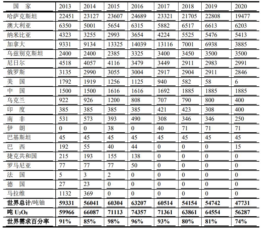 2020年世界上最大的鈾生產(chǎn)國(guó)仍然是哈薩克斯坦(占世界總產(chǎn)量的19477/47731=40.8%)、澳大利亞(6203/47731=13.0%)和納米比亞(5413/47731=12.0%)等這3個(gè)國(guó)家占全球總產(chǎn)量的65.8%;其他還有加拿大(8.1%)、烏茲別克斯坦(7.3%)、尼日爾(6.3%)和俄羅斯(6.0%)。