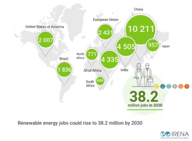 中國是太陽能光伏板的領先制造商和安裝商,海上風電工作崗位的數(shù)量正在增長。東南亞國家也正在成為主要的太陽能光伏制造中心和生物燃料生產國。