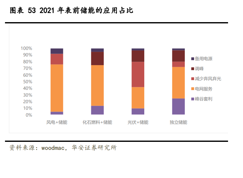 按照是否與新能源電站共址,可將儲(chǔ)能分為獨(dú)立儲(chǔ)能和新能源配儲(chǔ),2020 年之前美 國(guó)表前儲(chǔ)能裝機(jī)以獨(dú)立儲(chǔ)能為主,且主要滿足功率型需求,配儲(chǔ)時(shí)長(zhǎng)普遍較短,2021 年 起美國(guó)表前儲(chǔ)能中新能源配儲(chǔ)的裝機(jī)規(guī)模大幅領(lǐng)先獨(dú)立儲(chǔ)能。隨著越來(lái)越多光伏系統(tǒng)接 入電網(wǎng),預(yù)計(jì)能量型需求占比將提升,有望驅(qū)動(dòng)表前儲(chǔ)能平均配儲(chǔ)時(shí)長(zhǎng)提高至 4 小時(shí)。 表前儲(chǔ)能的主要作用為電網(wǎng)服務(wù)、峰谷套利、調(diào)峰、減少棄風(fēng)/棄光及備用電源,其 中獨(dú)立儲(chǔ)能主要側(cè)重于電網(wǎng)服務(wù)(50%),光伏配儲(chǔ)更側(cè)重于減少棄光(40%)。