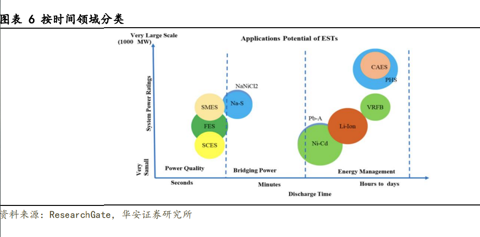 根據(jù)儲(chǔ)能時(shí)長(zhǎng),可以分為短期、中期和長(zhǎng)期儲(chǔ)能。根據(jù)能量釋放持續(xù)時(shí)間,可以將 儲(chǔ)能方式進(jìn)行區(qū)域分類。中等持續(xù)時(shí)間的類別分鐘到小時(shí)之間,功率范圍在 10-100MW。 長(zhǎng)時(shí)間類別跨度為數(shù)小時(shí)到數(shù)天,功率范圍在 300MW 以上。目前大多數(shù)部署的電池儲(chǔ)存 設(shè)施的儲(chǔ)存時(shí)間為 4 小時(shí)或更短,如鉛酸電池、部分鋰電池、電磁儲(chǔ)能,可用于調(diào)峰調(diào) 頻、平滑出力、緊急備用等;大多數(shù)現(xiàn)有的抽水蓄能設(shè)施的持續(xù)時(shí)間為 8 - 12 小時(shí)或更 長(zhǎng),屬于長(zhǎng)期儲(chǔ)能,可用于電網(wǎng)調(diào)峰調(diào)頻、備用容量等。每一種應(yīng)用對(duì)儲(chǔ)能技術(shù)都有其 特定的要求。一些應(yīng)用需要高功率和長(zhǎng)存儲(chǔ)時(shí)間,而另一些應(yīng)用則相反。因此,在采用 儲(chǔ)能之前,了解其技術(shù)特點(diǎn)及其應(yīng)用要求是非常重要的。