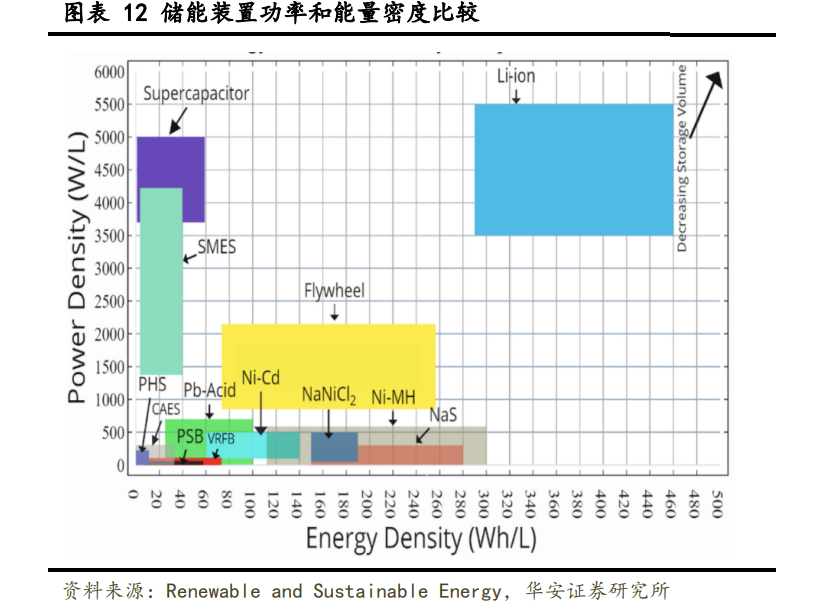 在功率和能量密度方面,電化學(xué)存儲(chǔ)系統(tǒng),特別是鋰離子電池,與其他能源存儲(chǔ)設(shè) 備相比,具有平均功率密度和能量密度較高的特點(diǎn)。因此,鋰離子電池具有體積小的優(yōu) 勢(shì)。在最新技術(shù)中,鋰離子電池也展現(xiàn)出優(yōu)勢(shì)。