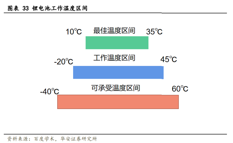溫控是指通過加熱或冷卻技術(shù)對電池的溫度進行有效控制和調(diào)節(jié)的過程。溫控系統(tǒng) 與電池管理系統(tǒng)配合,對鋰電池進行恒溫控制,使其維持在安全的參數(shù)范圍內(nèi),避免電 池進入熱失控狀態(tài)。鋰電池安全性、容量衰減受溫度影響較大。根據(jù)研究表明,鋰電池 最佳溫度區(qū)間為 10-35℃,過度的高低溫都會對鋰電池壽命和安全性產(chǎn)生影響。